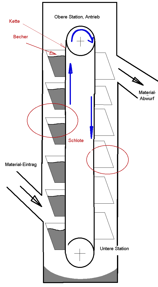 Der nächste Entwicklungsschritt war der Einbau von Elevatoren in der Mühle. Der Elevator bestand aus einem Gurt, der über Rollen in einem Kasten über mehrere Stockwerke senkrecht in die Runde fuhr, angetrieben durch Wind oder Wasserkraft.  Auf dem Band waren Becher befestigt, in denen das Mehl über mehrere Stockwerke transportiert wurde. Auch als Becherwerk bezeichnet.